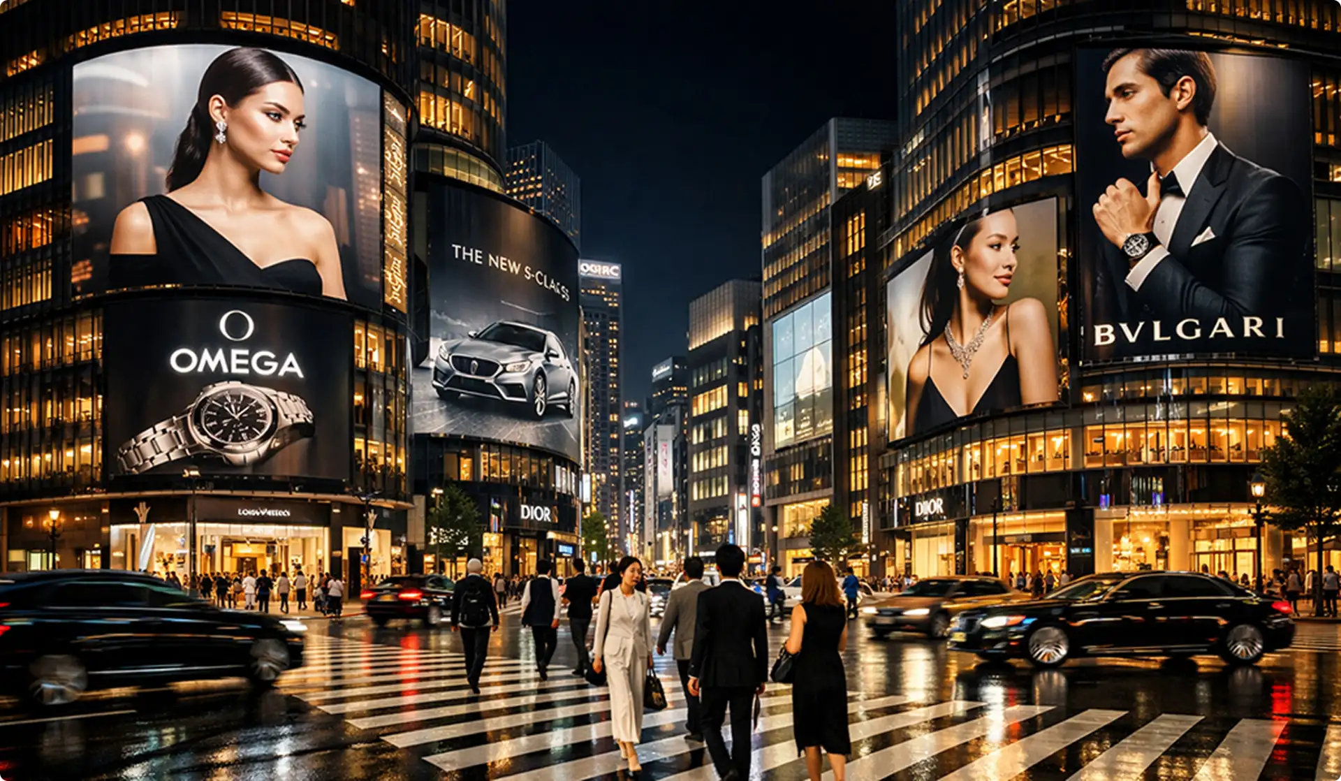 Support for video, static creatives, interactive media, VR/AR experiences and immersive 3D anamorphic displays.